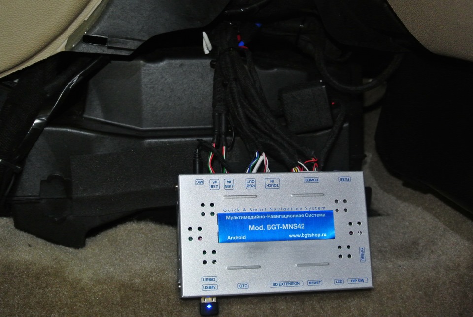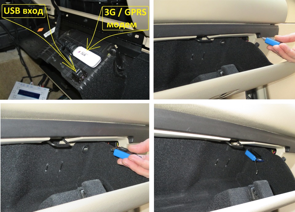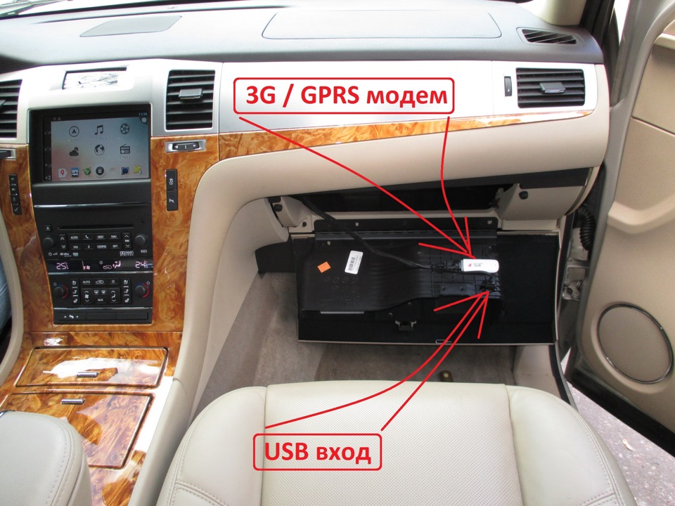 вот так организован монтаж 3G GPRS модема, который служит для связи с интернетом и получениея информации о пробках + USB входа для подключения различных устройств с USB коннектором: