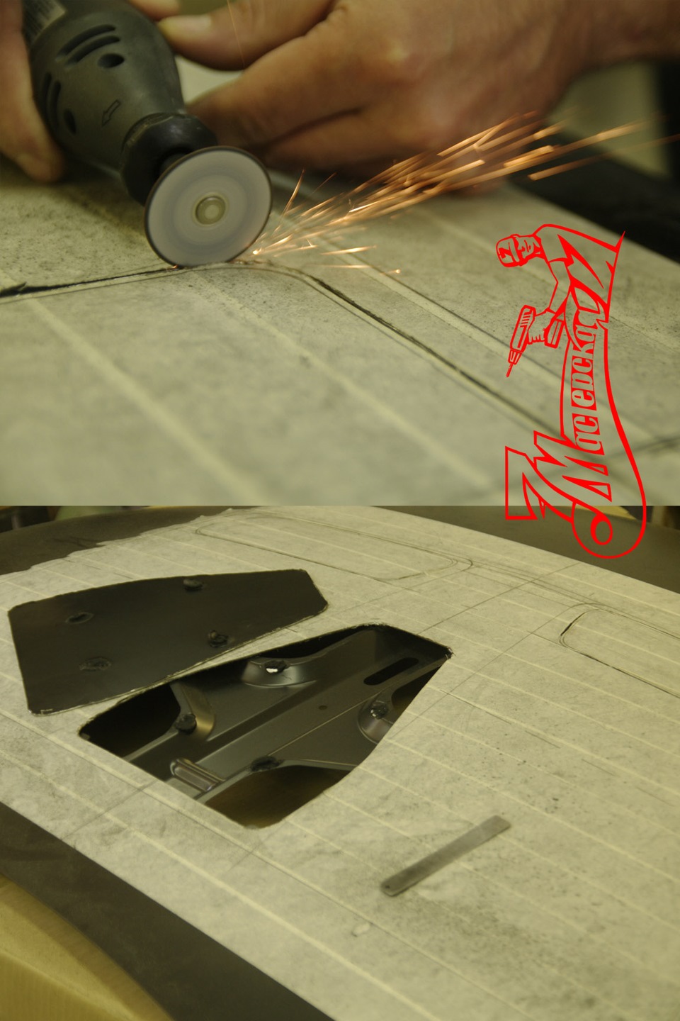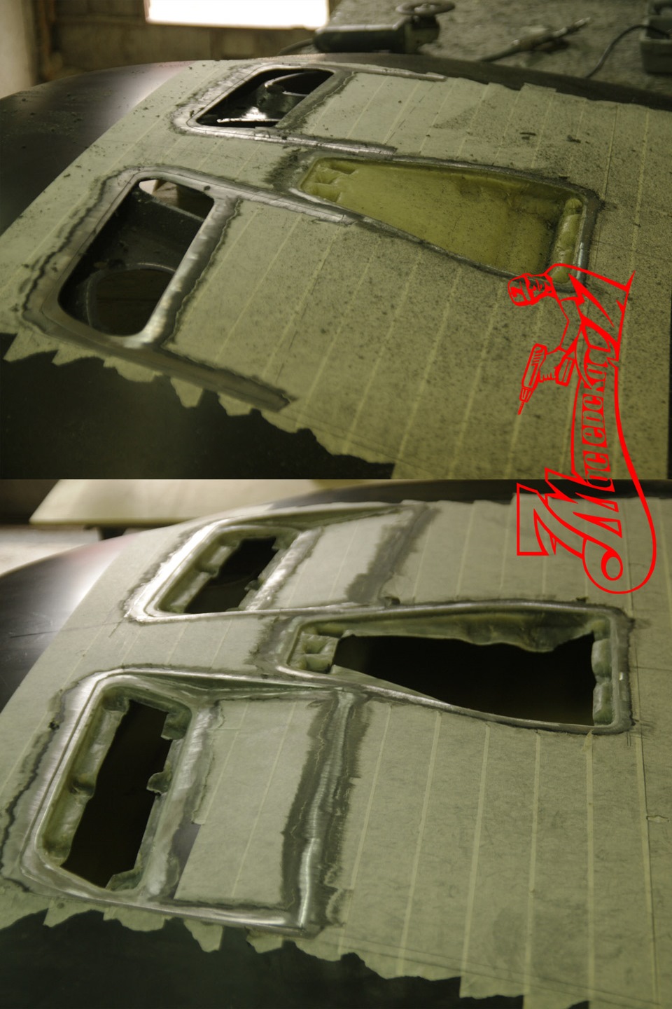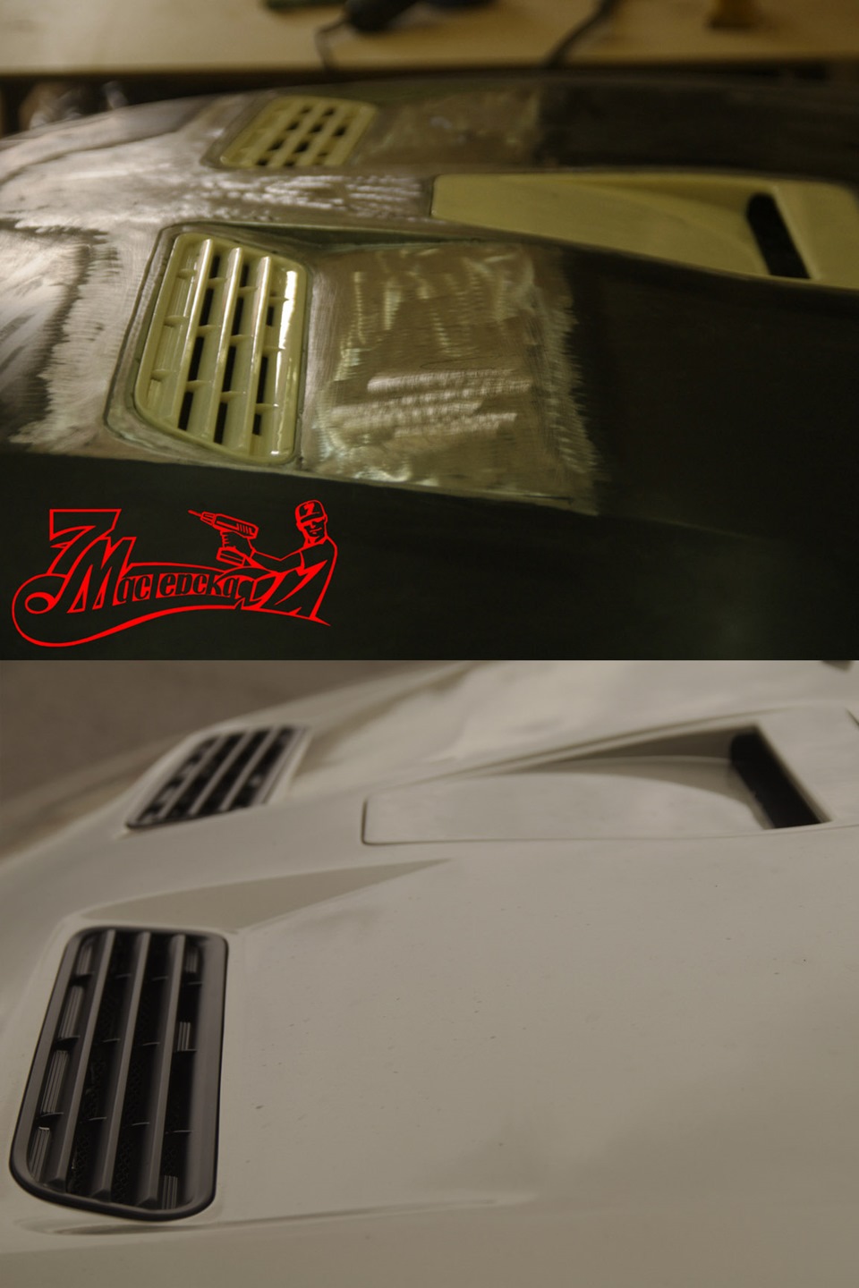 Было опасение, что изменение формы спровоцирует потерю форм и как следствие большое количество шпатлёвки. Однако грамотная последовательность резки и точный расчёт свели эти опасения к минимум. По словам хозяина капот даже стал легче прежнего.