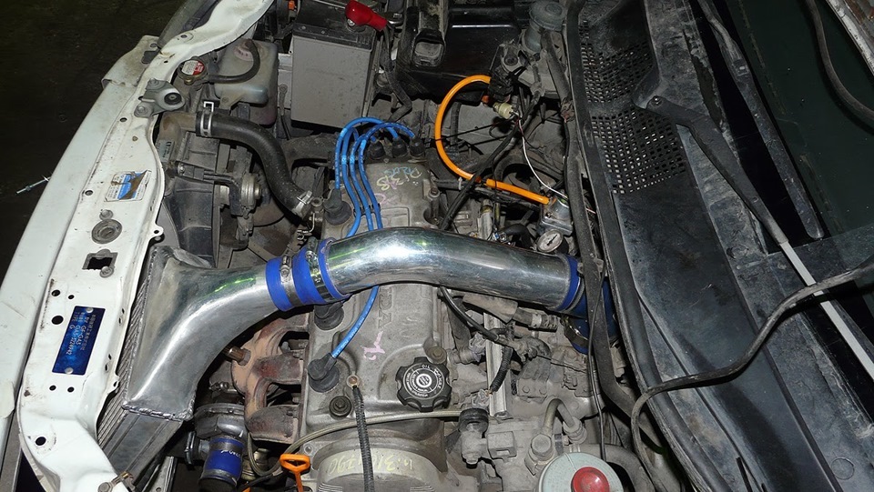 Устанавливаем впуск. Турбину и интеркулер соединяем одним резиновым шлагом снятым с системы охлаждения какого то мотора приготовленного к выбросу. Интеркулер и дроссельную заслонку соединяем с помощью одной алюминиевой трубы и двух силиконовых патрубков. Получается ультра короткий и компактный впуск.