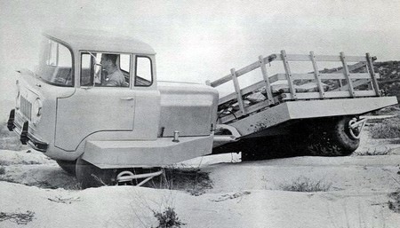 Traveler оснащен кузовом размером 2400 x 3000 мм для перевозки грузов, персонала, сельскохозяйственного и строительного оборудования и многого другого, включая монтаж специального оборудования — буровые вышки, медицинские и пожарные кузова. При работе в песке или на мягких почвах, по характеристикам Traveler превосходит трактора, а также совершенно не повреждает плодородный слой. Управление транспортером обеспечивается шарниром на раме, который разделяет конструкцию на 2 независимых блока — кабина с двигателем и грузовой отсек. Причем, при повороте, колея задних колес точно соответствует колее передних. При движении по бугристой поверхности, шарнирное соединение позволяет всем колесами постоянно оставаться в контакте с землей. Прототип оснастили 6-цилиндровым двигателем Continental объемом 3.7 л и мощностью 105 л.с. при 3600 об/мин. Наслаждайтесь…