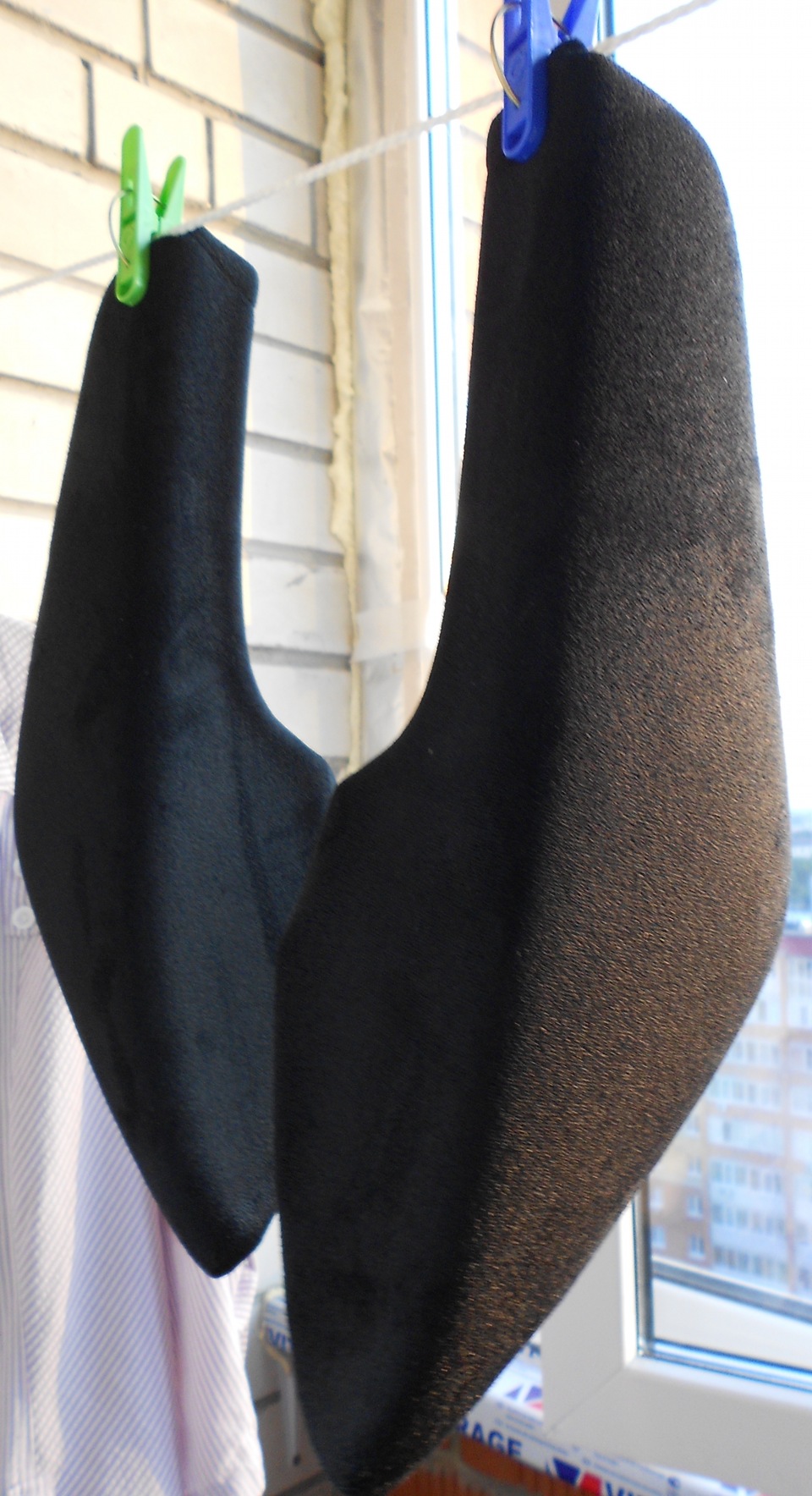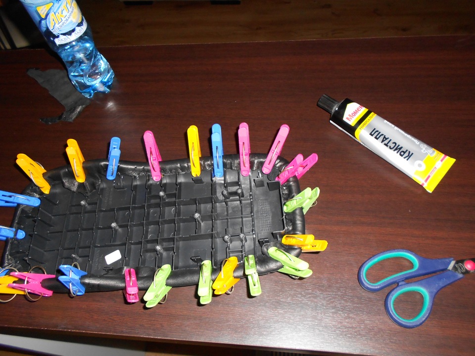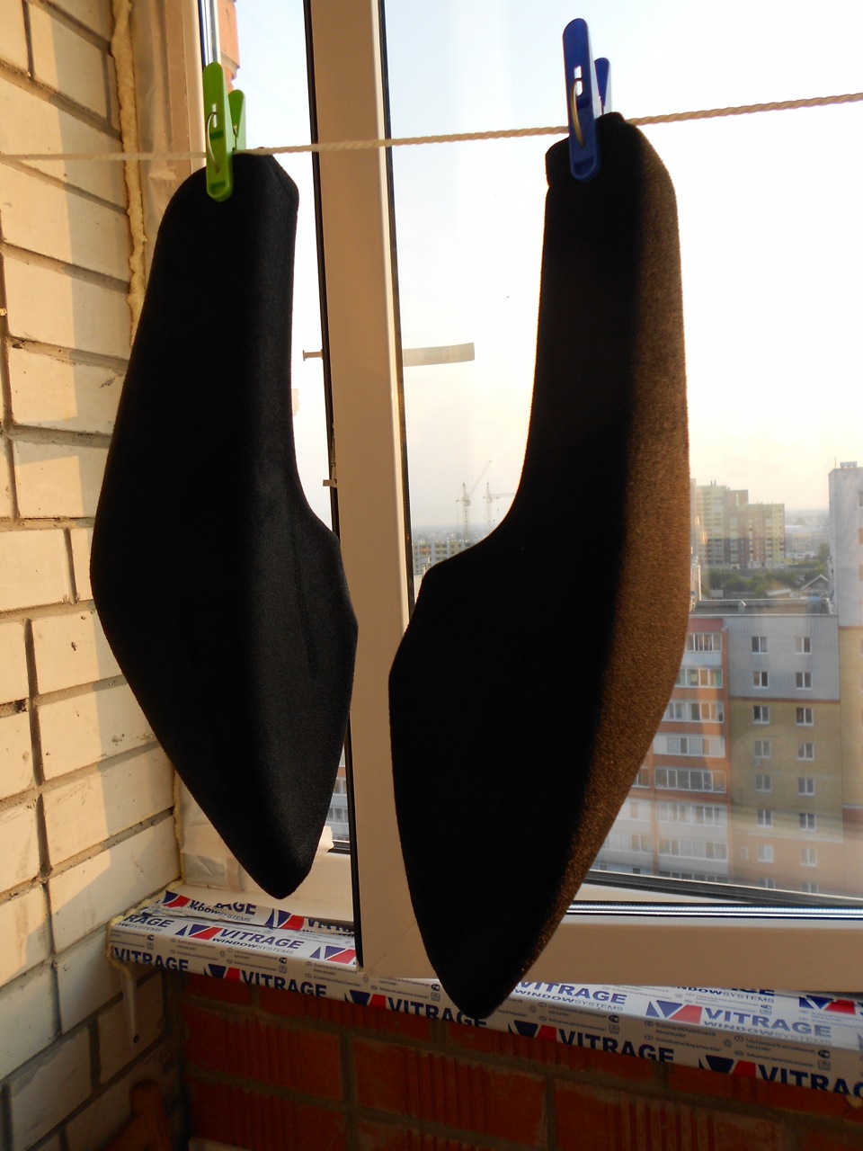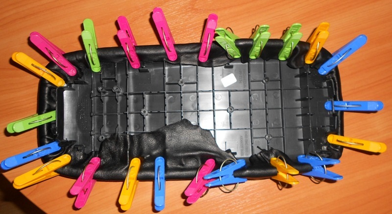 Саму кожу перед натяжкой намочил. Выжал от лишней воды и преступил к натяжке. Для фиксации использовал бельевые прищепки.