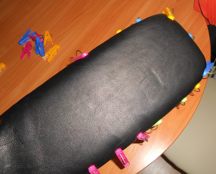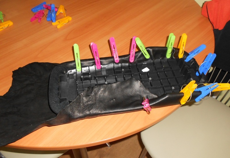 После обезжириваем кожу и наносим клей. Я использовал "момент универсальный". Через 4 часа снял прищепки и собрал подлокотник.
