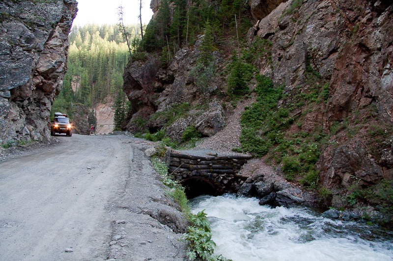 Жутковатое место под вечер. Вода бъет прямо под дорогу. Правда время уже почти 19.00 и мы начинаем искать ночлег. Сунувшись по небольшому плакату «Рыбалка, юаня на озере 5км», попадаем в горную колею и преодолевая грязь на полном приводе, идем туда, попутно думая, собственно на кого рассчитан этот плакат. 5 км едем почти полчаса. Приезжаем – два домика и баня, очень холодно. За дом просят 400 р с носа. Разворачиваемся. В итоге находим базу по 100р с носа, хозяином оказывается прапорщик пограничной заставы Акташа, родом с Кумертау. Очень обрадовался. Ночуем.