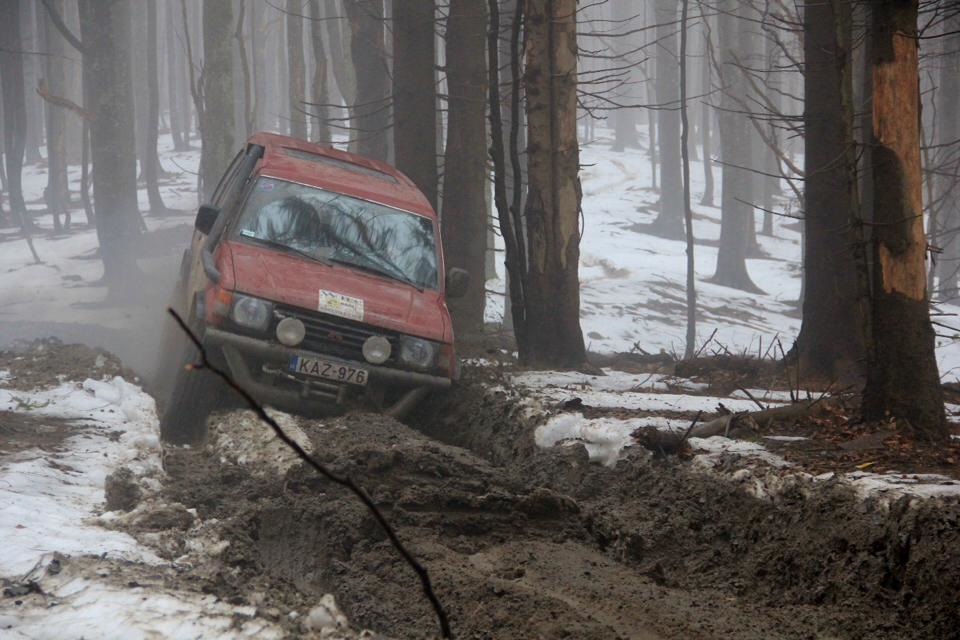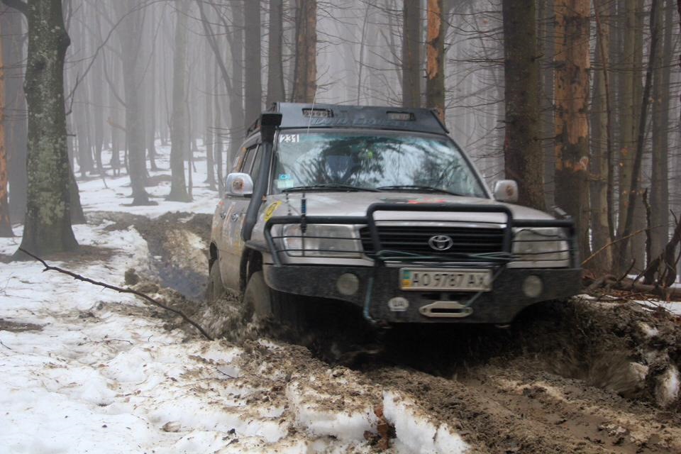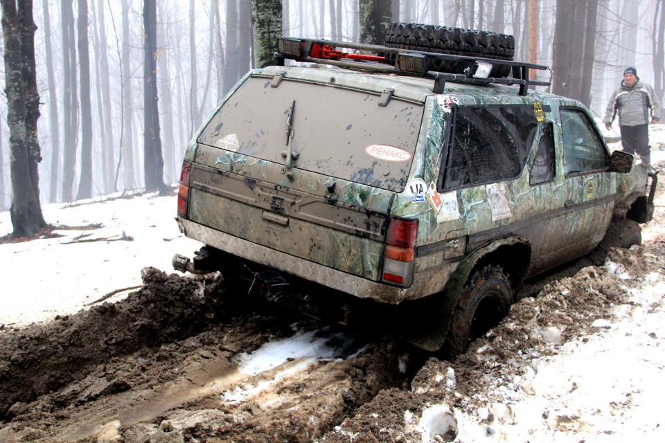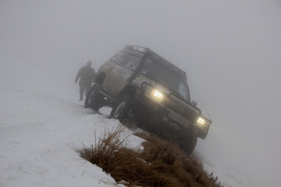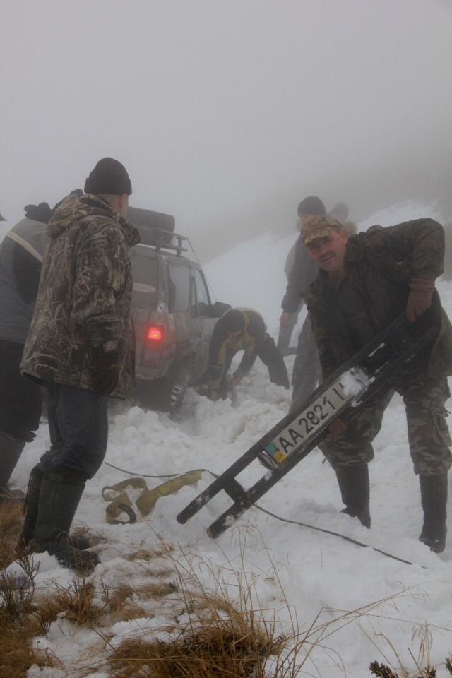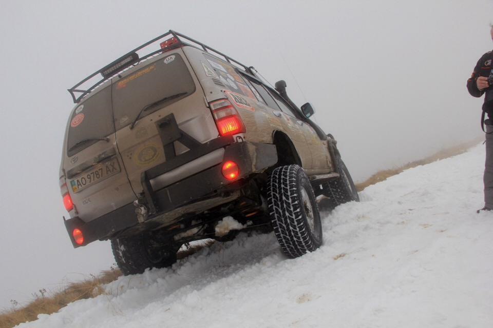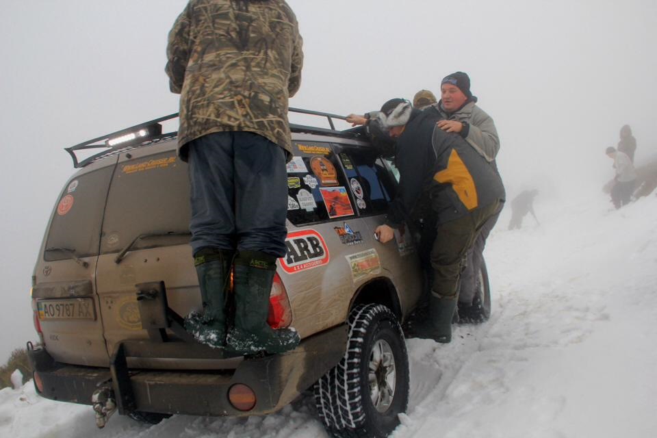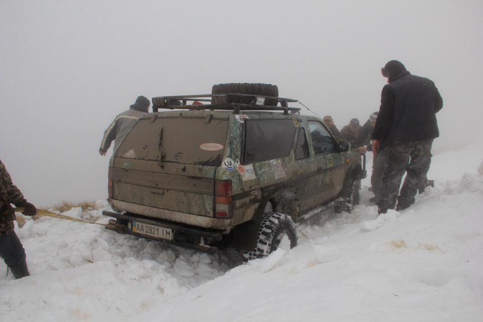 Благодаря аномально теплой зиме, решили заехать на гору Стой(1650 м.Закарпатье, близ г.Свалява).Попутно хотели найти признаки зимы и опробовать новую Йокогаму в 35" размере.Где то с высоты 1000 м. окунулись в настоящую зиму, снег нехоженый, а на джипах в такую пору никто и никогда не ездил.Если кто знает ту местность, то подъём мы осуществили с с.Березныки, поднялись через воен.часть на полонину и по траверсе перебрались на другой спуск.Видимость была нулевая, потому на серьезный штурм вершины не отважились, но высоту 1300 метров взяли.Езда по глубокому, хотя и плотному подтаявшему, снегу-это нечто, а тут ещё и траверсные уклоны над пропастью до несколько сот метров.Благо дело сильный туман, помогал не на класть в штаны…Играя давлением в шинах, довольно таки удачно выходил из разных незатейливых ситуаций и все же один раз пришлось зависнуть над обрывом…Все фото ЗДЕСЬ!