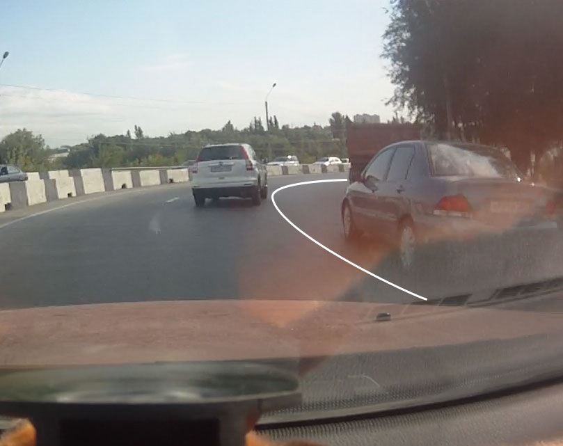 так там как бы лансер тоже сменил полосу уйдя за камазо в крайнюю правую а потом решила метнуться обратно…