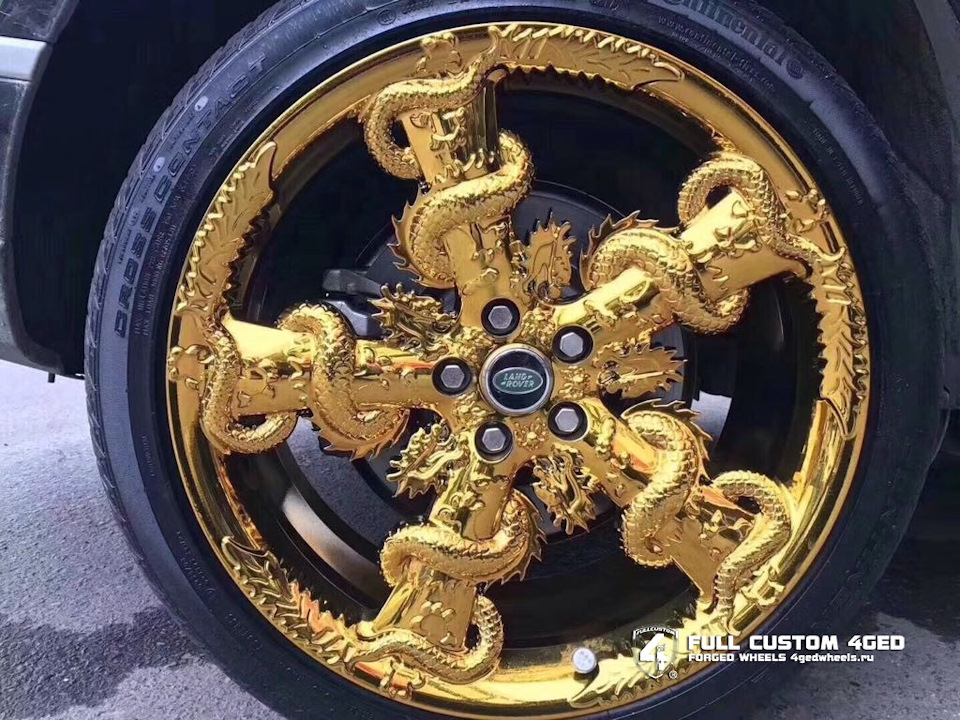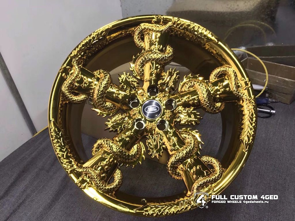 Друзья, представляем кастомные кованые моноблоки FULL CUSTOM 4GED в дизайне FC334. Выполнены для клиента из Азии на Range Rover в типично азиатском стиле — драконы на лучах в тщательной проработкой мелких деталей дизайна. и все это великолепие так удачно залито золотым хромом)) для русского человека картина неоднозначная, надо сказать, но тем не менее, демонстрируем уровень производственных возможностей))