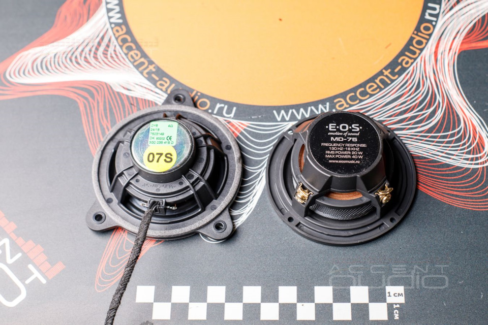 — Среднечастотники E.O.S MD-75. Тут всё же есть некоторый компромисс. Читающие сайт Accent-Audio знают, что в такой комплект мы бы неизбежно предложили бы лучшие серединки Brax ML3, но в конфигурации “пока останемся в штатных местах” им, конечно же, не место. Слишком хороши и слишком дороги ML3, чтобы задавить их прелести заводской дверной сеткой и расположением “в колено”. Поэтому заказчику был предложен такой вариант: сейчас ставим недорогие, но замечательные E.O.S MD-75, но если вы вернетесь за дальнейшим развратом, то в стойки мы уже будем интегрировать Brax ML3, стоимость же E.O.S зачтем в некоторые работы. Так будет честно и по отношению к звуку и по отношению к деньгам клиента.