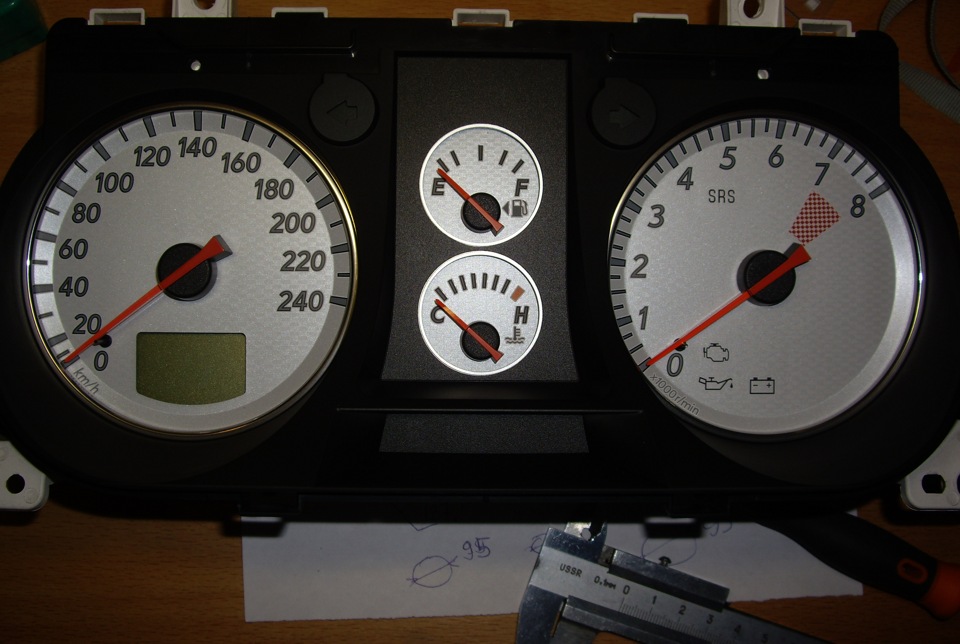 Поменять подсветку не поменяв шкалы оказалось не реально, потому что шкалы напечатаны на пластике и цветной фильтр зеленого цвета находится внутри между лицевой краской и основой шкалы. Еще одна сложность в том что шкалы формованные.