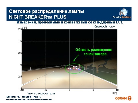 Лампы NBP изначально имеют больше Люмен. Но при этом они имеют двойной кольцевой светофильтр. Благодаря нему излишний световой поток «обрезается». Но не вся колба покрыта этим фильтром. Там где его нет, а это как раз то место, «ответственное» за зону 50-75 м перед автомобилем и по обочине, света падает больше. Освещенность в этих точках возрастает на 90% оп сравнению со стандартной лампой. При этом те места, в которых освещенность со стандартной лампой была естественной, появились дополнительные Люксы, что позволило увеличить световой конус на 35 м. кстати, свет более белый как раз из за голубого светофильтра.