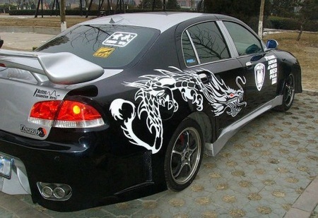 Мода на пленку "под карбон" постепенно сходит, этим уже никого не удивишь. Полосы через весь кузов скорее вызывают смех а не уважение в глазах окружающих. Чем можно привлечь внимание? — Обклеить всю машину виниловой пленкой! Можно в разные цвета. Чем больше разных цветов — тем "круче". Можно не обклеивать детали целиком, а нанести вырезанные по трафарету "узоры". Стыки могут не совпадать, уголки начнут отклеиваться через пару моек, это не важно. Внимание гарантированно. Впрочем, можно заморочиться и обклеить весь пластик в салоне цветной пленкой или пленкой "под карбон". Чем-то напоминает, как в старые времена в квартирах пленкой "под дерево" обклеивали 5 раз перекрашенные и местами облезшие межкомнатные двери и двери в туалет. Как правило, плотно собрать салон после разборки не получится ввиду изменившихся зазоров между деталями, и в холодное время года в жизнь владельца вносят разнообразие различные скрипы, стуки и "сверчки". Отдельной главой следует упомянуть про покраску суппортов "из баллончика". "Правильно" красить прямо на автомобиле, замотав газеткой и скотчем что-нибудь. Разбирать, очищать, обезжиривать суппорта не обязательно — главное с минимальными усилиями добиться желаемого результата. Когда "результат" облупится и облезет — можно перекрасить, к примеру, в другой цвет. Что-то похожее по технологии применяют девушки для покраски ногтей.