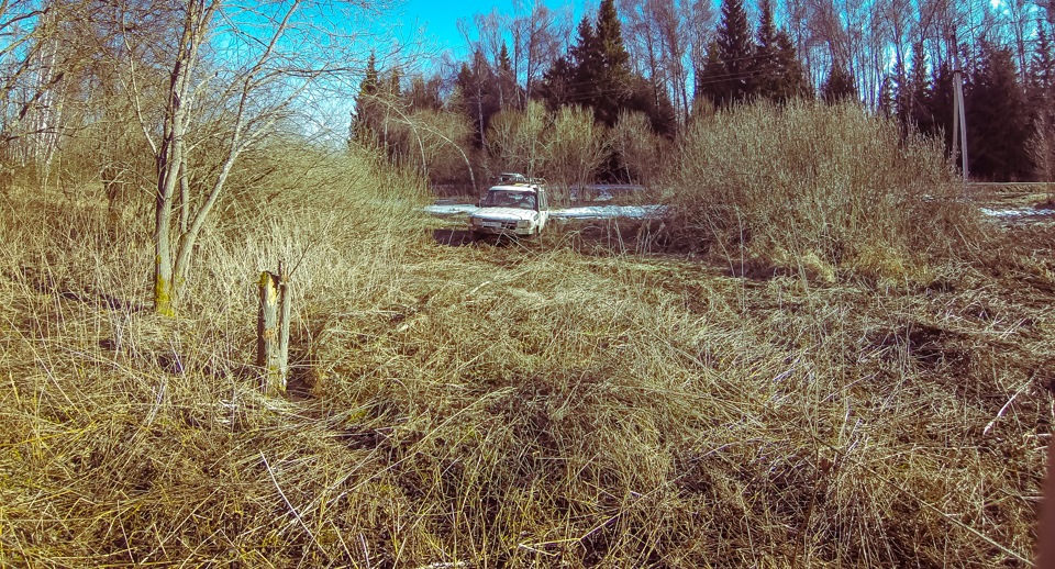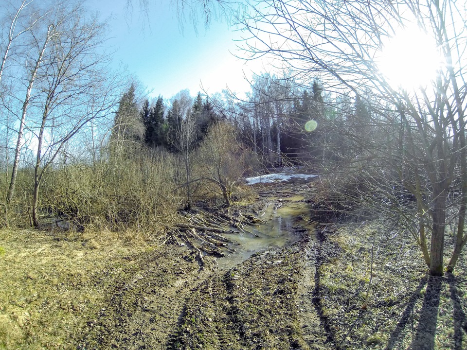 … каковой мы с JEEPом проезжаем, а хитрый Кирюха, чтоб не рисковать (а вдруг там под водой намесили?), едет в обход по показавшемуся ему более безобидным полю — из которого вытекает ручеёк и которое всё в небольших таких лужицах.