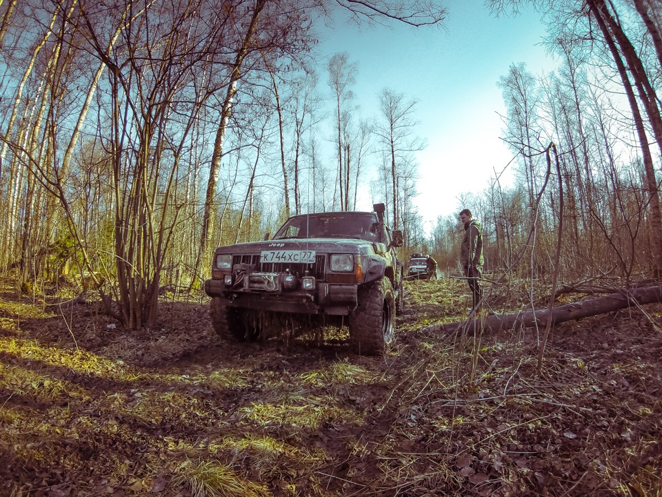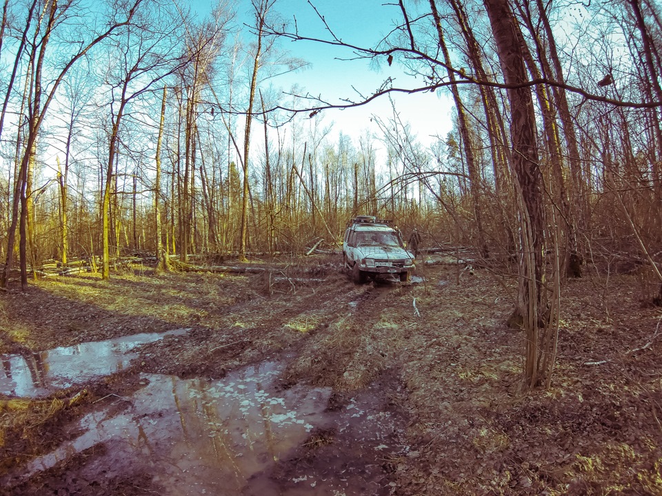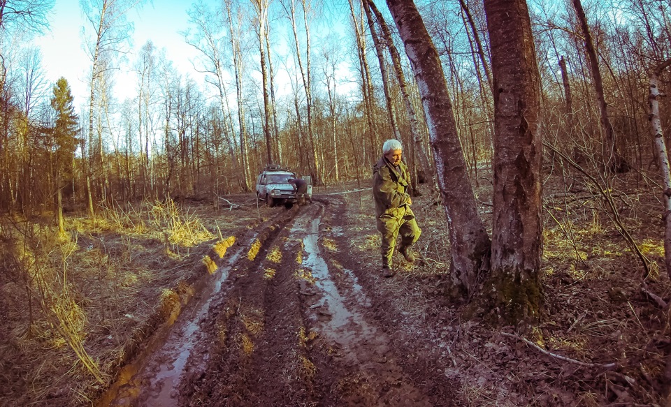 JEEP с ровером также лебедятся. Объезжаем лужу, возвращаемся на дорогу, грязи все больше, почва всё мягче, "китаец" начинает идти с трудом. Пару раз приходится сдавать назад и использовать метод "ходом", однажды вдруг перестало хватать клиренса (35"е на УАЗовских "порталах"), и, поскольку ночь и ощутимый минус, срубать замерзший верх колеи топором.