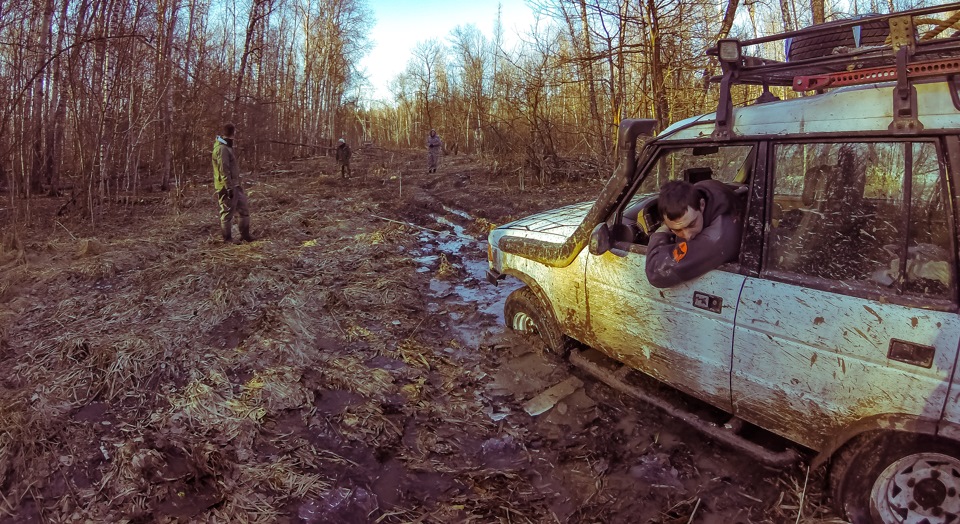 Пытаюсь таранить лед, зрители сзади наблюдают, прохожу примерно треть лужи, накатываю подводную колею, красиво застряю в ней, оценив положение и ракурс авты, ребяты начинают рубить объезд.