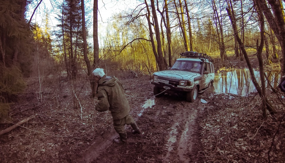 а вот замыкающий лендровер развлекается по полной — в колее не хватает клиренса, для вариантов типа "вразрез" возможностей шоссейной резины.
