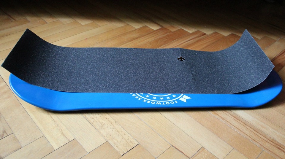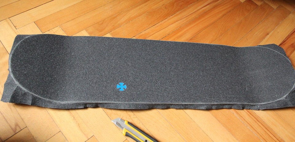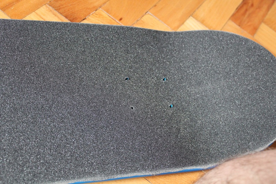 Берем шило, и прокалываем дырки под болты траков. Получаем идеальную деку с шкуркой и дырками