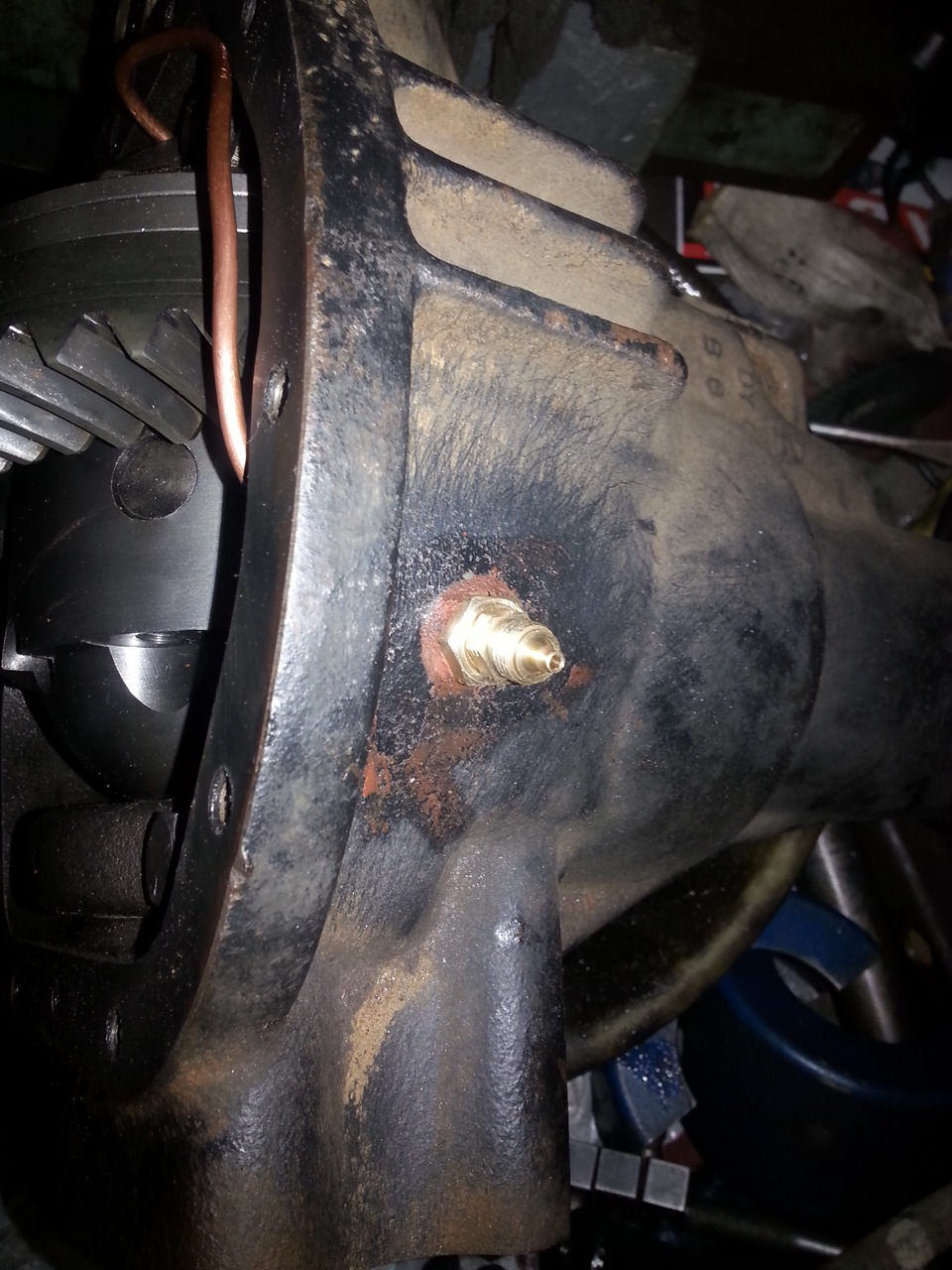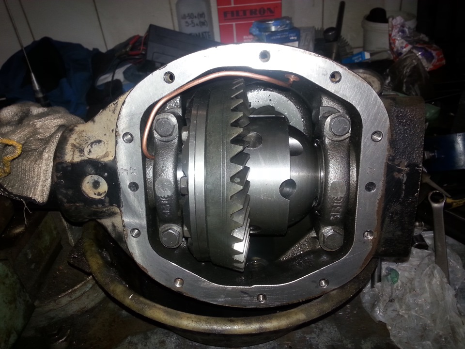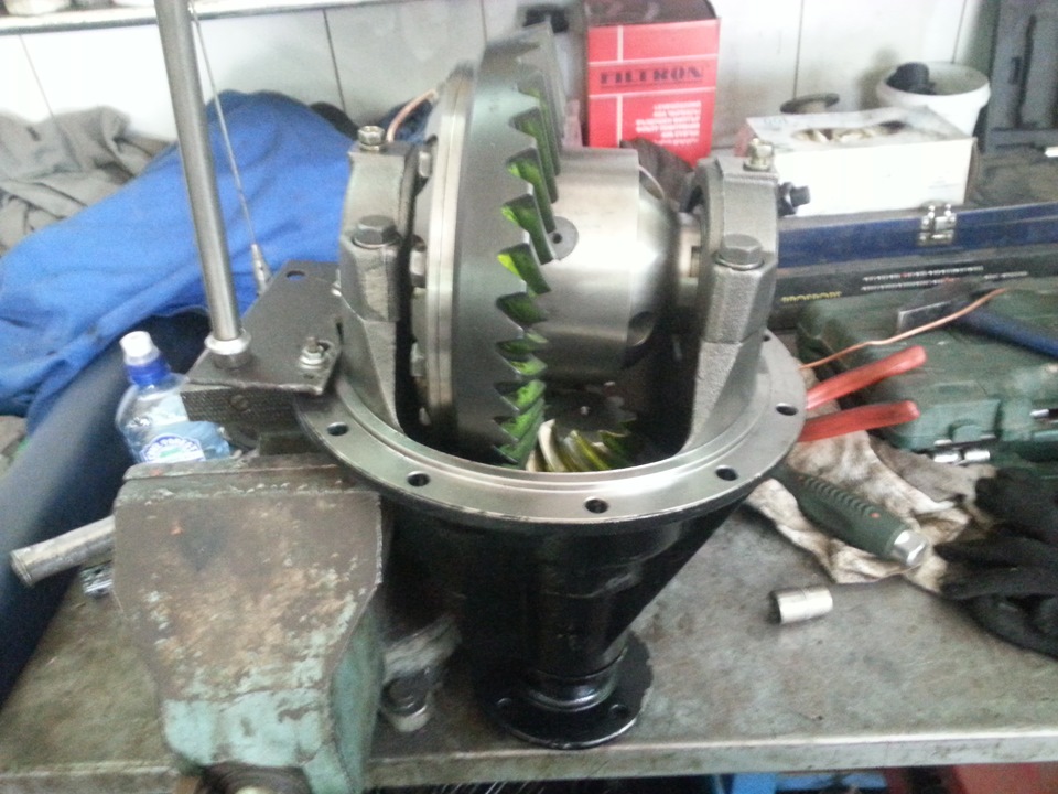 Приступили к переднему, вскрыли крышку и поняли что сегодня это дело не пойдёт и не потому что чего-то не хватает или что-то сложно. нет, просто мост который был куплен так же как и задний редуктор отдельно был от другой машины и имел другое передаточное число, по этому по переднему мосту отчёт будет позже.
