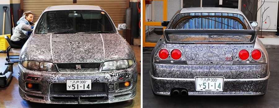 Один автолюбитель попросил жену-художницу закрасить пару царапин на бампере своего спортивного Nissan Skyline GTR. Когда он увидел этот потрясающий орнамент, он решил не останавливать жену и дать свободу ее творческому энтузиазму, тем более что серебристый цвет автомобиля никогда ему не нравился.