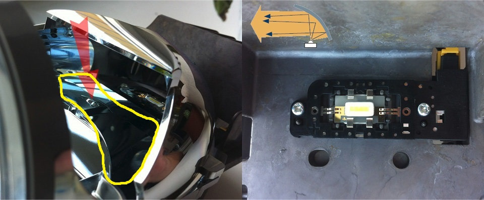 Конструктивно на радиатор с чипом одет отражатель, который направляет световой поток на линзу, а кромка отражателя, отмеченная стрелкой, формирует светотеневую границу.