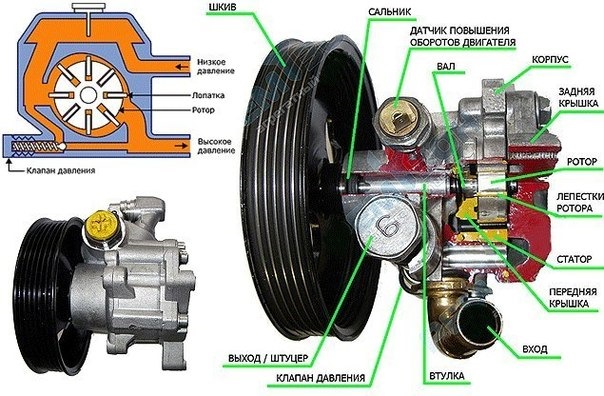 Насос гидроусилителя, как и любой другой насос, предназначен для создания и поддержания необходимого давление в системе и циркуляции рабочей жидкости (специального масла). Конструкция насоса может быть разной. Самые распространенные — лопастные, характеризующиеся высоким к.п.д. и износоустойчивостью. Насос крепится на двигателе и приводится в действие с помощью ремня от коленвала.