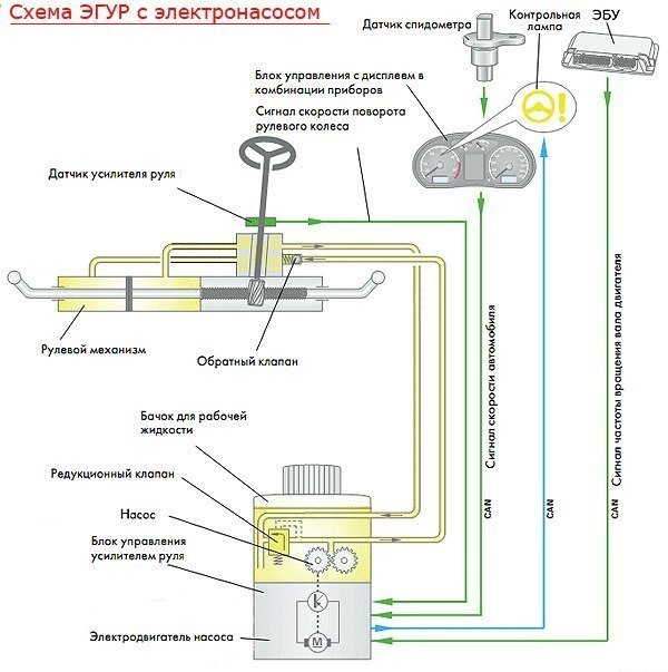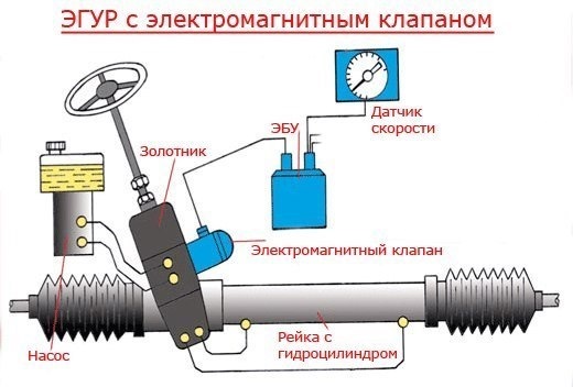 В первой конструкции в распределитель ГУРа дополнительно встраивается электромагнитный клапан и камера обратного действия с поршнем. При повороте колес на месте или при движении с малой скоростью клапан открыт, давление в системе максимально — руль крутить легко. При наборе скорости клапан, управляемый блоком, пропорционально закрывается. В результате давление в системе уменьшается, а усилие на руле увеличивается. Таким образом, получаем искомое чувство "обратной связи".