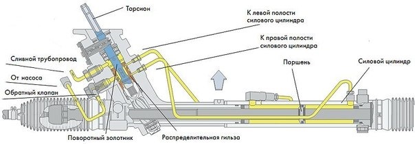 Как все это работает? Когда руль неподвижен (автомобиль стоит на месте, или движется по прямой), и система гидроусиления не задействована, в распределителе совмещены маслопроводы подачи и стока. Жидкость вхолостую перекачивается насосом через распределитель обратно в бачок. Когда водитель поворачивает руль, тем самым он закручивает торсион, а вместе с ним крутится и внутренняя часть золотникового клапана. Внешняя же часть пока остается неподвижной. Таким образом совмещаются каналы подачи жидкости в соответствующую полость силового цилиндра (в зависимости от того, в какую сторону повернут руль). Из другой полости силового цилиндра жидкость по открывшимся каналам сливается в бачок.Чем на больший угол повернут руль, тем сильнее закручивается торсион. Поэтому большим оказывается и размер перепускного отверстия, а, значит, и усилие, воздействующее на рейку. Рейка, перемещаясь, раскручивает через шестерню нижний конец торсиона, а вместе с ним и внутреннюю часть золотника. Обе части клапана возвращаются в исходное положение, и жидкость вновь перекачивается через распределитель в бачок.