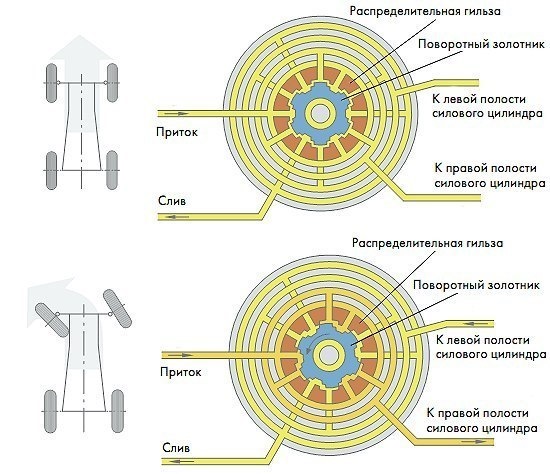 Распределитель, в зависимости от положения руля, направляет поток жидкости в соответствующую полость силового цилиндра или обратно в бачок. Он устанавливается на рулевом валу. Основные части распределителя — золотниковый клапан и торсион. Клапан состоит из двух цилиндрических частей с каналами для жидкости: внешней и внутренней. Торсион — это тонкий пружинистый металлический стержень, способный закручиваться под действием крутящего момента. Один конец торсиона соединен с рулевым валом, а второй — с шестерней, входящей в зацепление с рейкой. Внутренняя часть золотникового клапана соединяется с верхней частью торсиона, а внешняя — с его нижней частью.