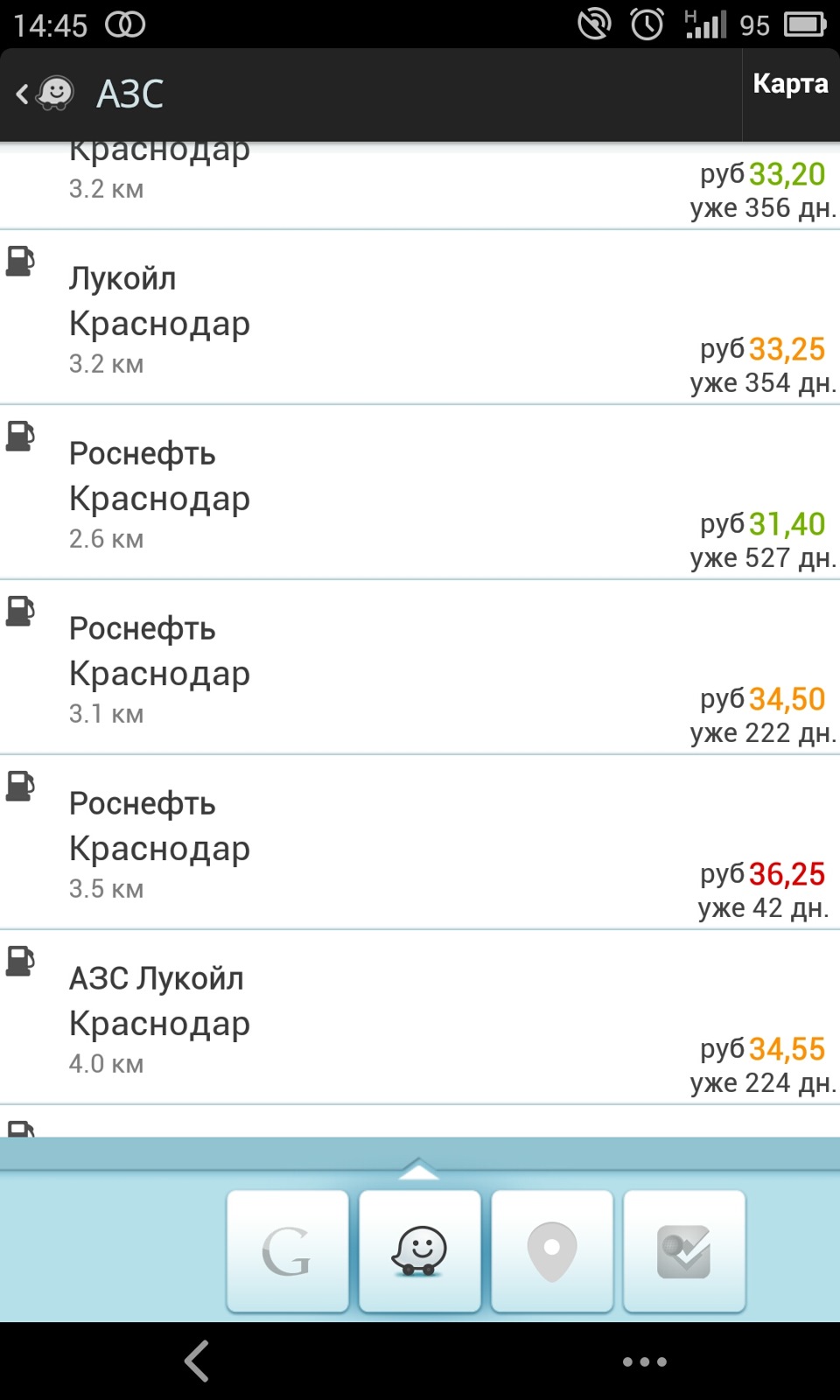 Конечно же есть в Waze и такая возможность как поиска АЗС и цены на каждом из них.