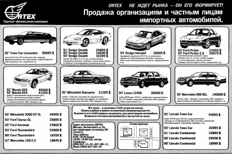 Большой популярностью пользовался американский автопром: именно в 90-е в наши страны попало огромное количество (как новых, так и б/у) всевозможных Pontiac, Chevrolet, Buick, Oldsmobile, Mercury, Lincoln, Plymouth, Eagle и прочей заокеанской экзотики. Как-то брат одного моего товарища привез из Москвы черно-белую газету авто-объявлений (забыл название) с предложением тогдашних автосалонов. Чего там только не было: Chevrolet Camaro, Ford Mustang и даже GMC Typhoon! Правда, самым дорогим лотом все же было купе Mercedes-Benz 600SEC.