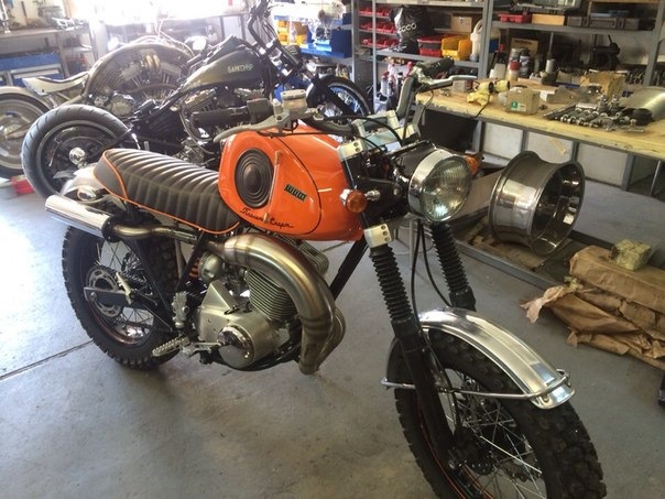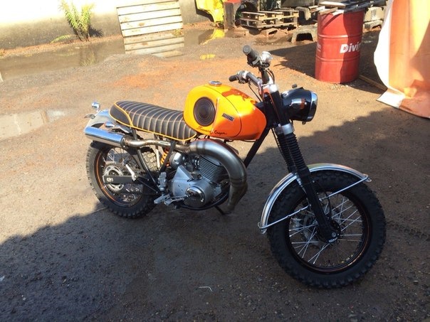 Так вот, одной из последних работ компании Yuri Shif Custom стал оригинальный скрэмблер на базе советского ИЖ Планета Спорт. Кто не знает: скрэмблер — это своего рода смесь стритового байка с эндуро. Характерными признаками данного класса мотоциклов являются спицованные колеса с зубастой внедорожной резиной, широкий руль, поднятая вверх выхлопная труба, тонкая сидушка и общий минималистский дизайн.