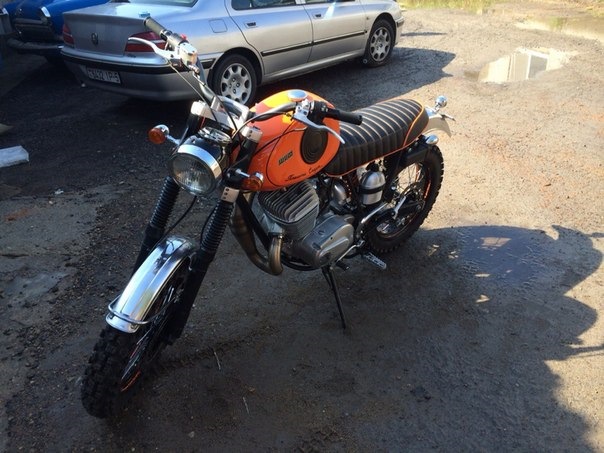 вот у меня 87м или 88м г.тоже был ИЖ СПОРТ, тоже такого цвета рыжего ) и конечно же на нём я, и труба выхлопная внизу, всё как положено, а не под яйцами, выжимал я на нём 150км, но это смертельно опасно, когда начинаешь сбрасывать газ,