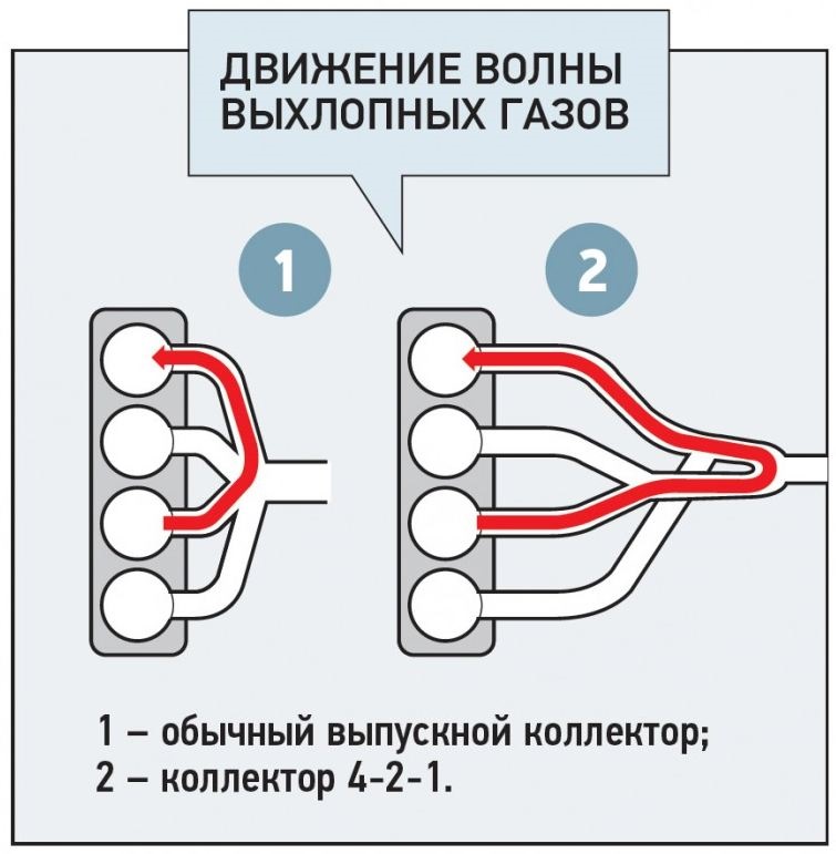 У конструкции «спортивного» коллектора иная схема соединения труб, вдобавок они длиннее. Из-за этого поток ОГ проходит большее расстояние и, наоборот, создает волну разрежения, которая облегчает выход газов из следующего цилиндра. Помимо повышения мощности мотора это снижает температуру в камере сгорания, также уменьшая вероятность детонации.