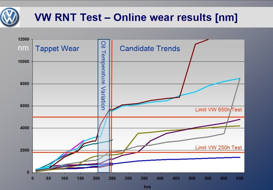 Самое интересное в этом списке RNT Wear test – это Radio–Nuclid–Technique, радионуклидный тест на износ деталей. По неофициальным данным, производитель масла платит за него 81тыс $. Изначально он был внедрен из-за проблемы повышенного износа кулачков привода насос-форсунок.