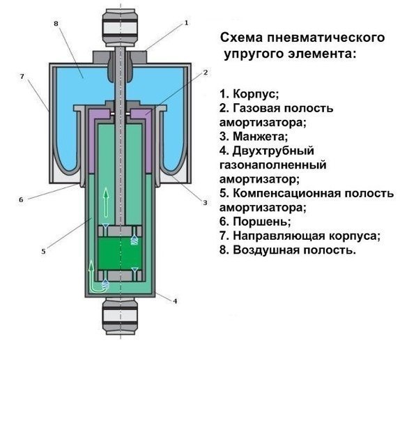 Пневматический упругий элемент выполняет основную функцию подвески – поддержание определенного уровня кузова автомобиля. Это достигается путем изменения давления и соответствующего ему объема воздуха в упругих элементах.