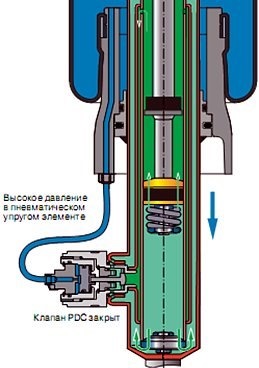 Применение амортизаторов с регулируемой степенью демпфирования значительно расширяет характеристики пневматической подвески, позволяя помимо высоты кузова изменять жесткость подвески в зависимости от условий движения.