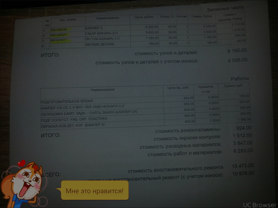 А пока предварительно прошерстив РСА (в среднем цены устроили, как не удивительно) я ужаснулся увидев цену на заднее крыло, которое вваривается…они оценили его в 7200!+ вычит износа 40% и у нас на руках около 5к, когда самый реальный ценник на оригинальную деталь будет 20к-это жопа полная, не иначе, а отдавать на ремон, это тоже кот в мешке, если не знаешь сервис или сделают криво, а всплывёт это позже или поставят китайские детали или и то и другое сделают…Короче РСА это минус для обычных смертных страхователей.