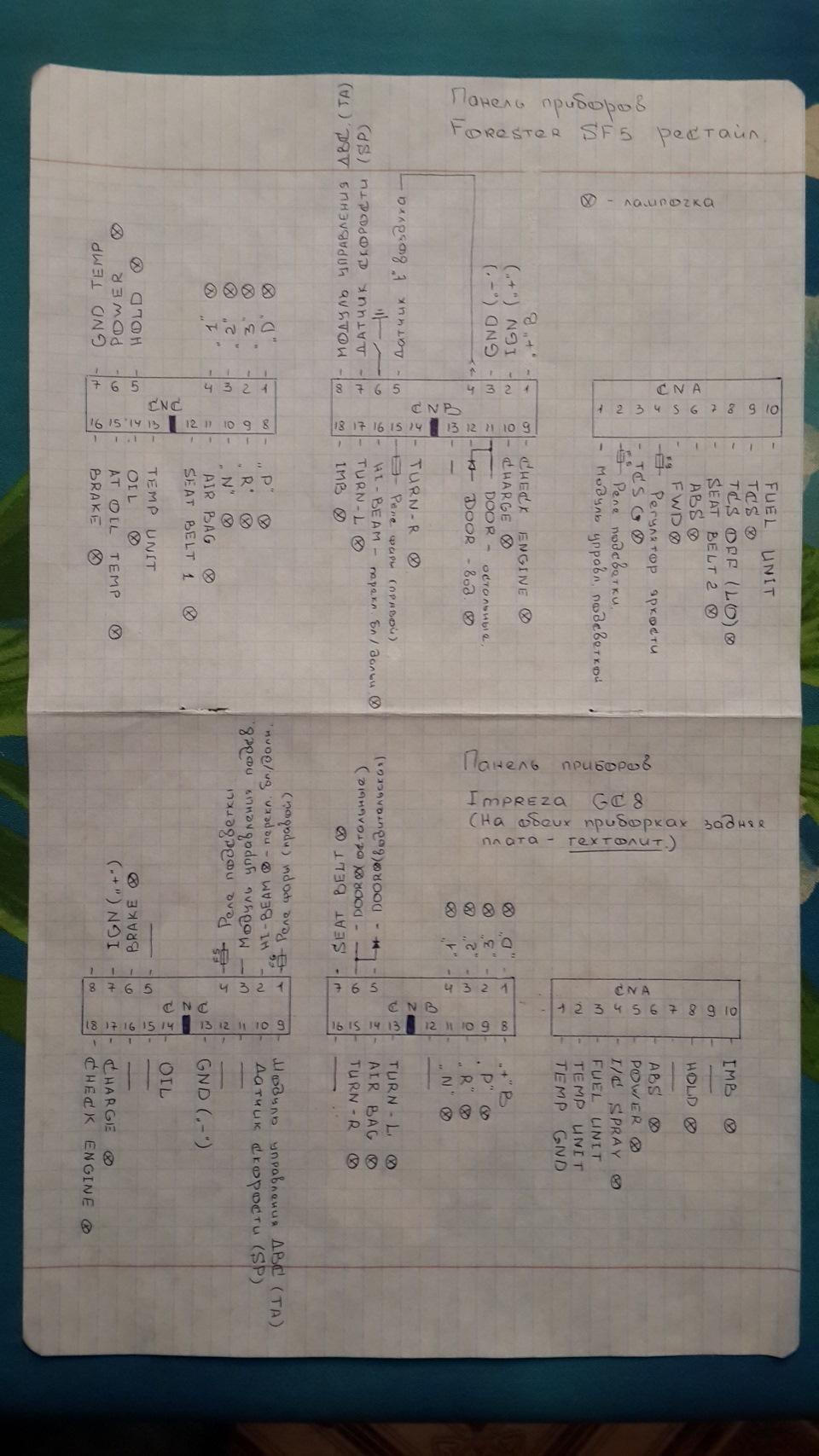 Привет. Хотел узнать на твоем рисунке где импрезовская распиновка, там фишки номерацию ты делал с задней стороны, или с лицевой строны фишки куда идет на приборку, у тебя там чет цифры зеркальное отоброжение ?