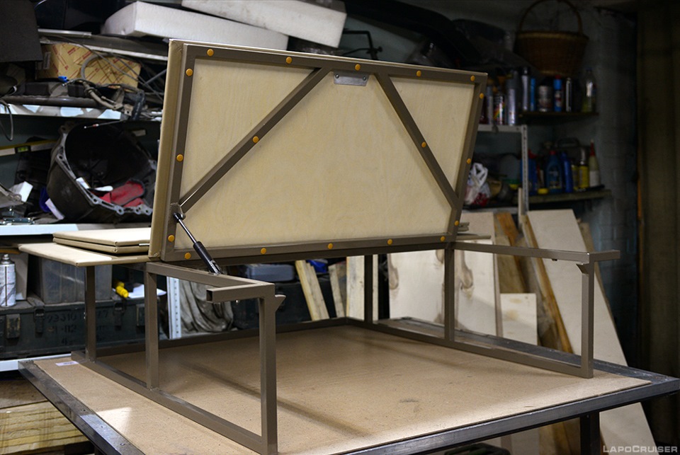 Защёлки теперь стали лишней деталью. Смещение точки крепления аморта на 7-8 мм от горизонтали притягивает крышку вниз и держит закрытой вполне надёжно. Крышка теперь закрывается тихо. Правда, пальцы надо беречь :)