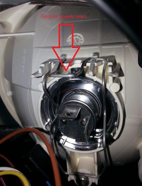 Ну небольшое дополнение — на самом деле проволочную защелку не надо тащить на себя и тем более вверх. На самом деле нужно пальце надавить на этот язычок вниз и при минимальном усилии защелка выходит из пазов. По этому никаких доп. инструментов не нужно. У меня замена лампочки заняла 3 минуты — понятно без фотографирования. А вот фотоотчет был полезен — спасибо.