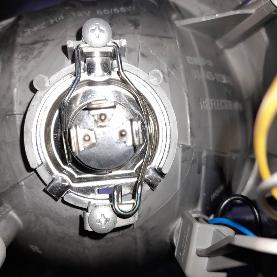 Снятая скоба. Ну, теперь все просто — аккуратно вытаскиваем лампочку (она теперь просто болтается, ничто ее не держит), вставляем на место нее новую, желательно в чистых перчатках, чтобы грязь и жир с рук не попали на лампу. Следим чтобы она попала в пазы (достаточно просто поставить ее так же как стояла прошлая)