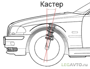 Кастр, кастер или кастор (рис.7) — угол между вертикалью и проекцией оси поворота колеса на продольную плоскость автомобиля. Продольный наклон обеспечивает самовыравнивание управляемых колёс за счёт скорости автомобиля. Другими словами: автомобиль выходит из поворота сам; руль, который отпущен и обладает свободным ходом, сам возвращается в положение прямолинейного движения (на ровной дороге, с отрегулированными механизмами). Это происходит, естественно, при положительном кастре. Например, кастр позволяет ездить на велосипеде, не держась за руль.