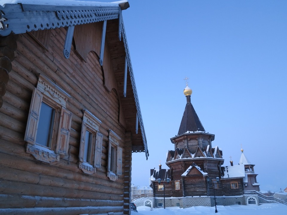 В воскресенье я решил сходить на утреннюю службу в Свято-Богоявленский храм, один из двух храмов в НАО, первый мы посетили в селе Несь. Встал пораньше, помятуя что вечером было тепло, всего -20С, одел свитер и жилетку, и пошел пешком через половину города. Первые же шаги показали опрометчивость моего туалета, сквозь свитер совершенно беспардонно по всему телу расползался мороз… Минут пятнадцать рысью, и я, окоченевший, вошел в храм. Первые минут десять я просто грелся. Потом стал обращать внимание на убранство, на прихожан, на атмосферу, но по началу было совершенно не до этого, мозг анализировал органы и конечности на предмет обморожений.