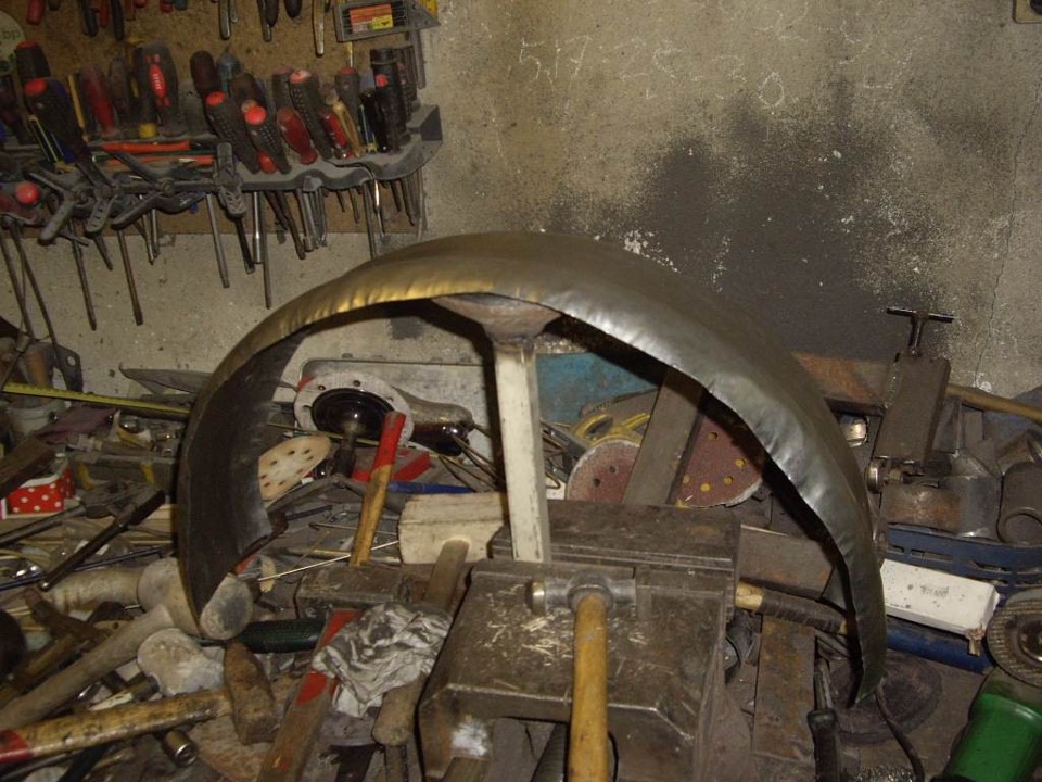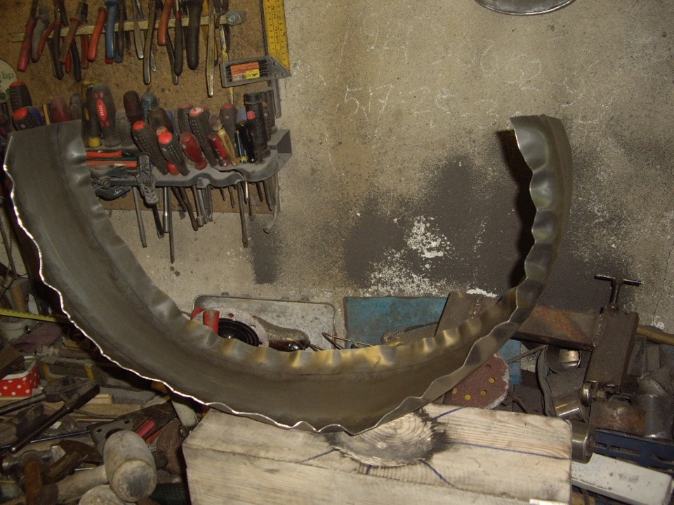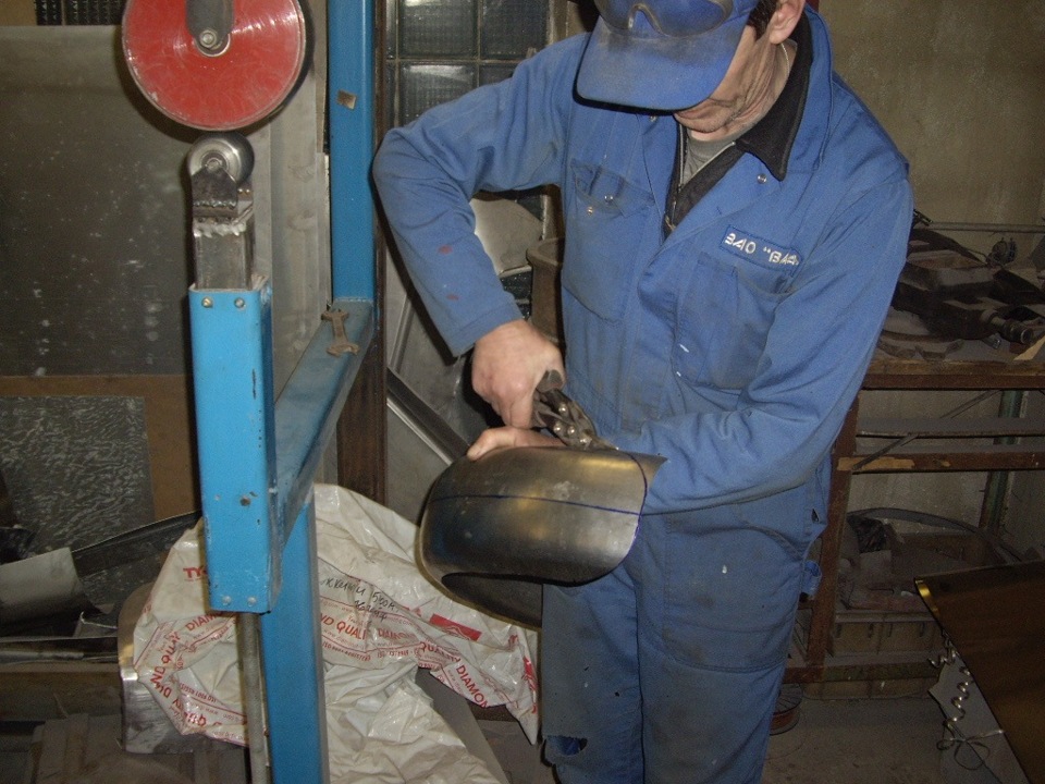 Затем — обрабатывал края будущего крыла сначала плоским рихтовочным молотком, превращая складки сначала в круглые пузырики, а потом забивая эти пузыри так, что от них не оставалось и следа. После прошелся по краям плоской деревянной киянкой, и край стал практически ровный. Все это делалось на выпуклой круглой наковаленке по имени "Долли", установленной в тисках.