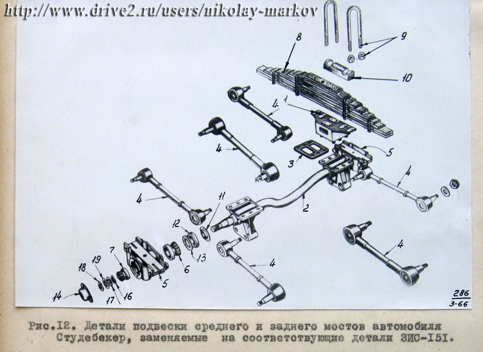 Американские ведущие мосты также можно было комплексно заменить мостами от ГАЗ-63 (передний) и ЗИС-151 (средний и задний). На модели US6x4 при этом требовалось произвести перекладку карданных валов, поскольку картер главной передачи среднего моста у «американца» был смещен вправо, а у советского грузовика – влево. У фирменных карданов при этом изменялась длина и переделывались вилки. А замена мостов на модели US6x6 обязательно должна была сопровождаться и заменой раздаточной коробки (перекладка задних карданов при этом уже не требовалась). Кроме того, необходима была переделка тормозов на осях тележки из-за разности типов привода (у Студебекера – гидравлический, у ЗИСа – пневматический). Благо оснащение «зисовских» мостов гидравлическими рабочими цилиндрами вместе с колодками и барабанами от Студебекера выполнялось несложно. Кстати, в случае износа фирменных тормозных цилиндров их также можно было заменить на советские (от ГАЗ-51 и Победы) или отремонтировать путем замены штатных поршней, манжет и пружин на аналогичные детали от ГАЗ-51.