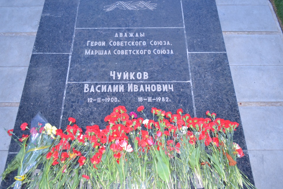 У памятника на Мамаевом кургане — бойца с автоматом и гранатой и надписью на постаменте «Стоять насмерть!» лицо маршала Советского Союза Василия Ивановича Чуйкова — главного военного консультанта мемориала, похороненного на его территории.