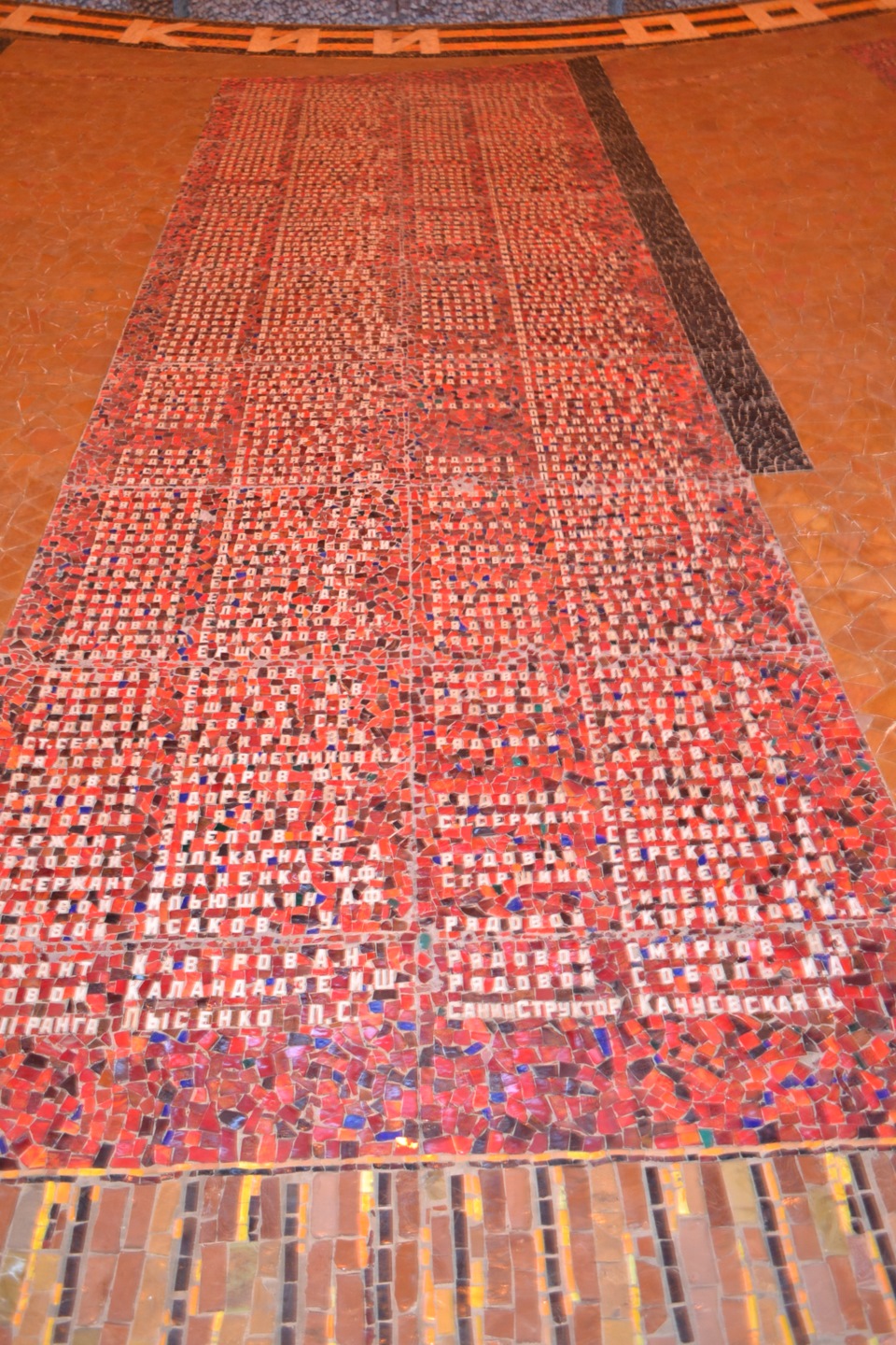 Спиралевидный двухметровый пандус из белого мрамора медленно поднимается вдоль стен, давая возможность обойти весь зал. Ведет он к трапециевидному выходу из зала, расположенному прямо над входом на следующий элемент ансамбля — площадь Скорби.