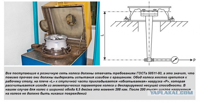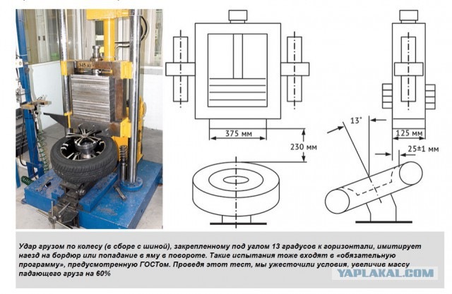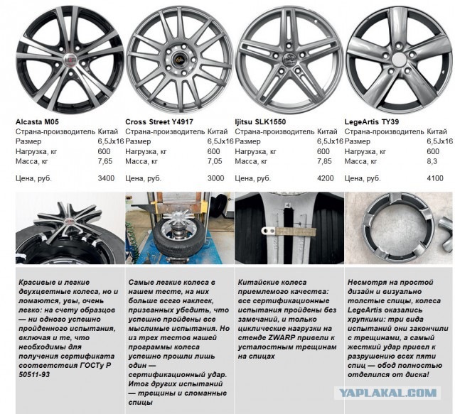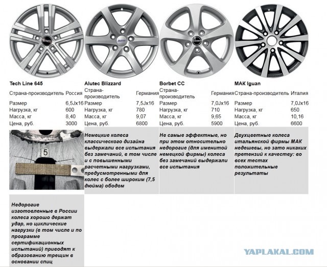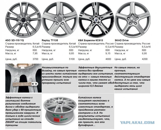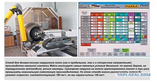 Первые, и пока что единственные, сравнительные испытания колес мы провели — страшно вспомнить! — 17 лет назад: это были «ударные» тесты в лаборатории МАДИ (АР №15, 1998). И вот мы возвращаемся к этой теме, но уже на качественно ином уровне: появились современные стенды и новые методики — и теперь мы сможем оценить не только стойкость к ударам, но и усталостную прочность легкосплавных колес. В зачете — 12 образцов 16-дюймовых моделей, произведенных в России, Китае, Италии и Германии.Первые, и пока что единственные, сравнительные испытания колес мы провели — страшно вспомнить! — 17 лет назад: это были «ударные» тесты в лаборатории МАДИ (АР №15, 1998). И вот мы возвращаемся к этой теме, но уже на качественно ином уровне: появились современные стенды и новые методики — и теперь мы сможем оценить не только стойкость к ударам, но и усталостную прочность легкосплавных колес. В зачете — 12 образцов 16-дюймовых моделей, произведенных в России, Китае, Италии и Германии. Как сильно изменился рынок колес! Двухцветные, матовые, полированные, подешевле, подороже, потяжелее, полегче… Выбирай на любой вкус и цвет! Тем более что за прочность-надежность, по идее, можно не переживать: все продаваемые в России колеса обязаны иметь специальный сертификат, который выдается лишь в том случае, если образцы прошли испытания, оговоренные ГОСТом Р 50511-93. Или производитель предоставляет в органы сертификации результаты испытаний, проведенных по схожим методикам в других странах, и при этом, конечно, гарантирует, что вся поставляемая на рынок партия продукции соответствует тем образцам, что прошли тесты. Но это — по идее, а точнее — по закону. Теперь набираем в поисковой строке «получить сертификат на колесные диски» — и Яндекс выплескивает адреса-телефоны десятков организаций, готовых «в сжатые сроки» оформить сертификаты на соответствие российским ГОСТам и техническому регламенту Таможенного союза! Неужели в России и впрямь так много лабораторий (они, кстати, тоже должны быть сертифицированы), где можно испытывать колесные диски? Может, зря мы летали в Красноярск? Не зря. Потому что именно в Красноярске, на базе завода компании K&K, был недавно запущен дорогущий стенд циклических испытаний ZWARP (от немецкого Zweiaxialer Radprüfstand — двухосевые стендовые испытания колеса) немецкой фирмы Makra.Колеса мы тестировали так. Беговой барабан стенда ZWARP раскручивает колесо в сборе с шиной размерности 215/60 R16 до «линейной» скорости 120 км/ч — и за пробег около 2300 км оно подвергается циклическим перегрузкам (кратковременно — до 1800 кгс, что в три раза больше, чем заявленные производителями для большинства из наших колес предельные 600 кгс), которые имитируют самые жесткие условия эксплуатации: движение на перегруженном автомобиле, резкие перестроения, проезды неровностей. Причем так называемая карта нагрузок для наших испытаний была сформирована на основе данных, полученных при езде именно по российским дорогам. Если колесо успешно пройдет такие испытания, то можно быть уверенным, что в реальной эксплуатации не появится ни усталостных трещин, ни разрушений. Другое точно такое же колесо, но уже без шины, тоже подвергается циклическим нагрузкам, но на стенде попроще. Обод жестко крепится к металлическому столу, а к ступичной части прикладывается циклический момент с вращением. Эти испытания —