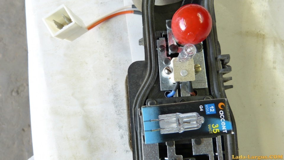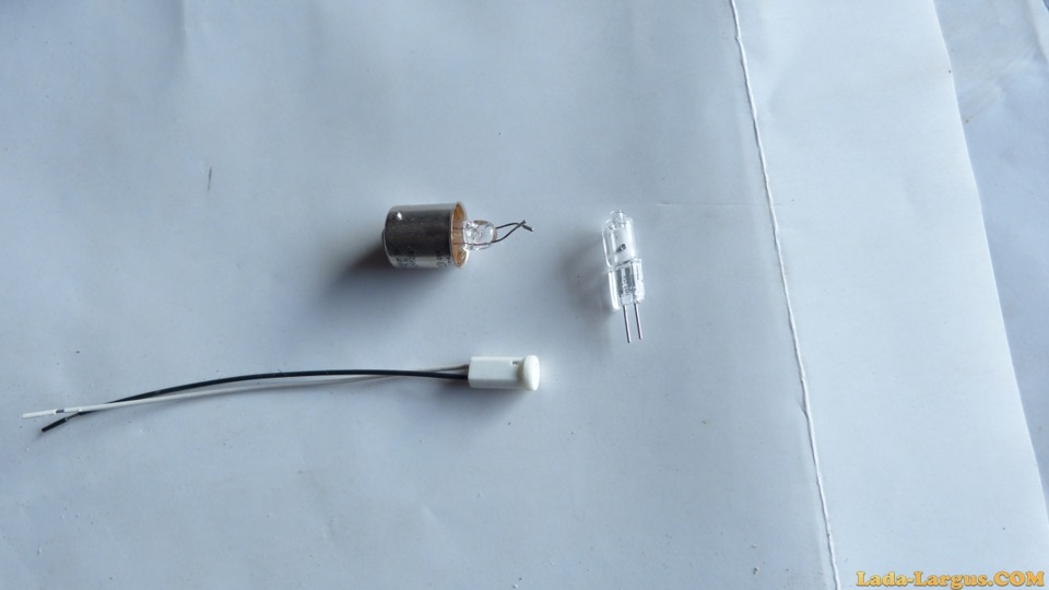 Красные лампочки есть в автомагазинах(я покрасил лаком, буду менять на светодиоды).Такие патроны есть в любом магазине электротоваров(10-15 руб). Спросите патроны для галогенок G4.