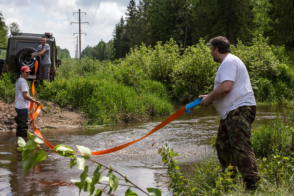 С грехом пополам уговорили УАЗовода стать сакральной жертвой. Но для того, чтобы все прошло без эксцессов придумали хитрый план. На той стороне собираем нужное колеичество удлинителей и надежно их крепим. Трос лебедки разматывается и пилот, как только закинет морду на тот берег, начет себя подтягивать, чтобы не затопить багажник.