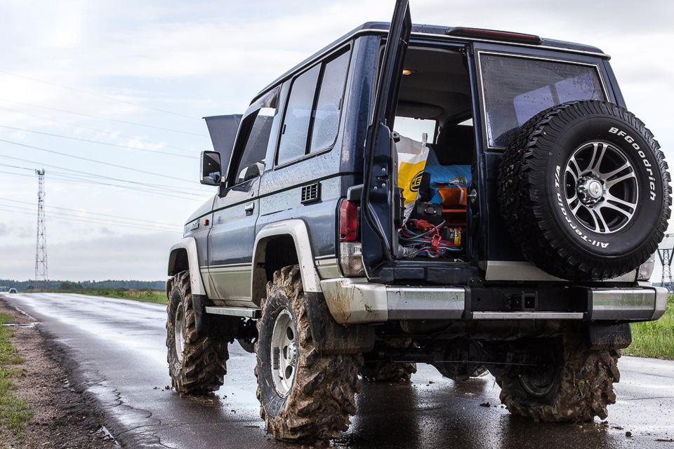 Я еду фотоштурманом на вот этой красавице. Это 70ка, легкая серия, с турбомотором 1kz-te. Состояние, не смотря на почти 20 летний возраст, у автомобиля просто потрясающее. И как вы видите обут автомобильчик в в отечественные тракторные шины ФБел-160М.