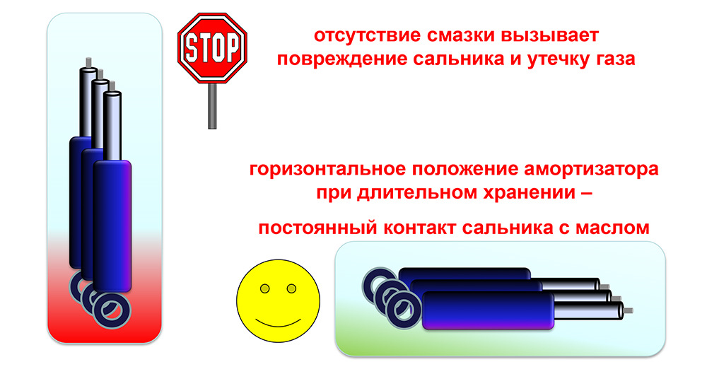 наоборот, и транспортировать и хранить амортизаторы надлежит только в горизонтальном положении!